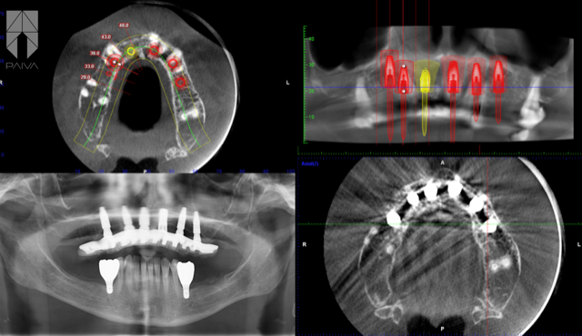 Face à ce plan de traitement, nous avons décidé de procéder à l’implantation de 6 implants concomitante aux extractions dentaires, suivi de la pose immédiate d’une prothèse fixe sur les implants.